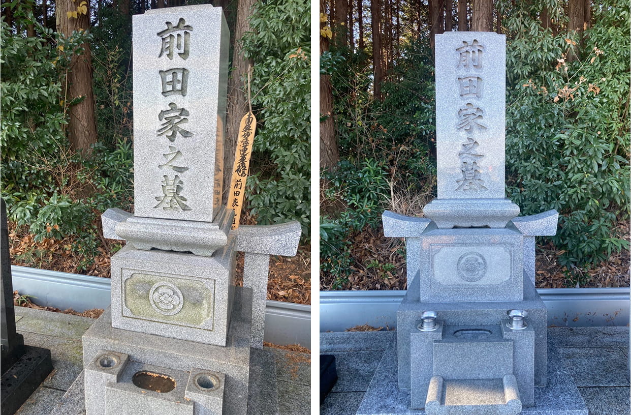 石材加工の技術と、革新的な特殊コーティング技術を融合させ、大切なお墓を「建て替えずに強く美しく再生する」サービスです。お墓のお掃除が水拭きだけで綺麗になります。