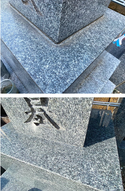 外部からの雨水の侵入を防ぎ、内部の水分は蒸発させることで、石を傷めず長持ちさせることができます。重機を用いないため、施工は短時間・低コストでのご提供が可能です。